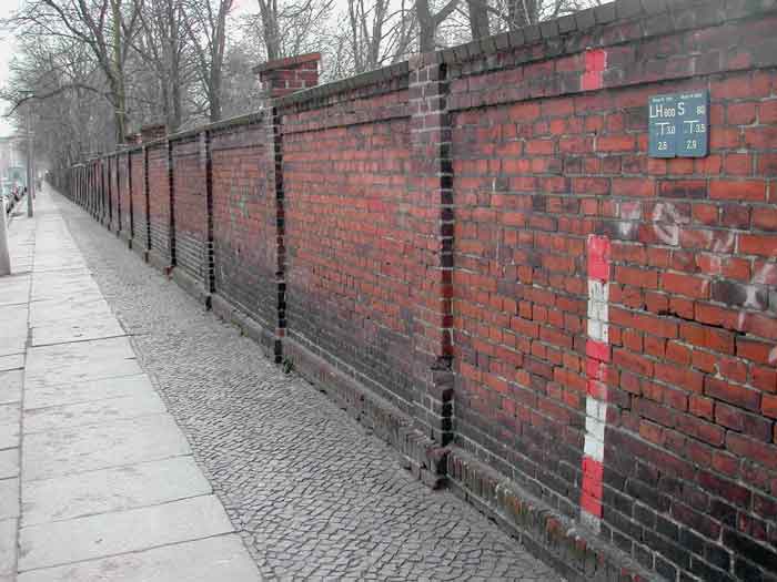 Grensmarkering in de Ackerstrasse. Deze muur is op mijn foto te zien links achter de wachttoren.