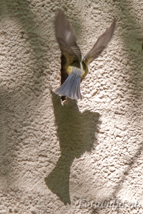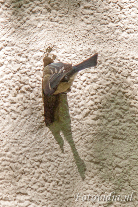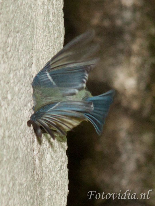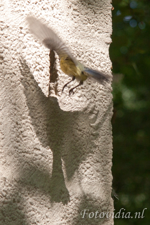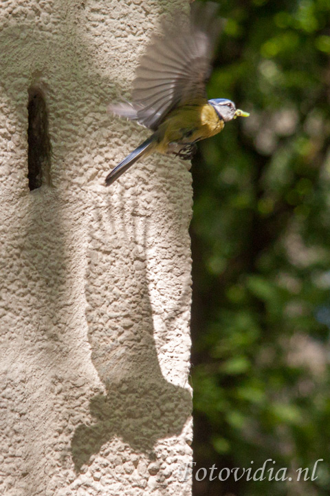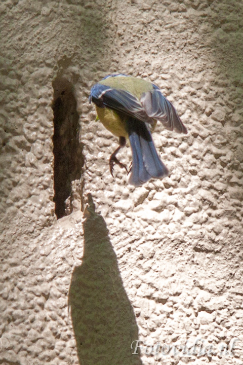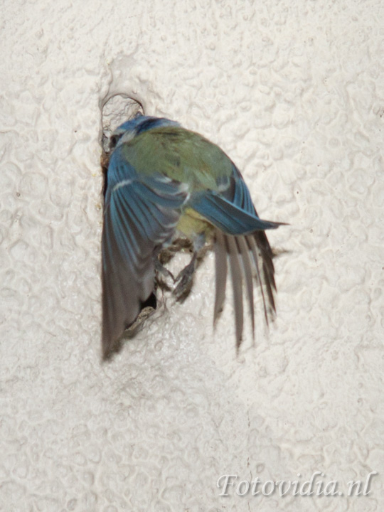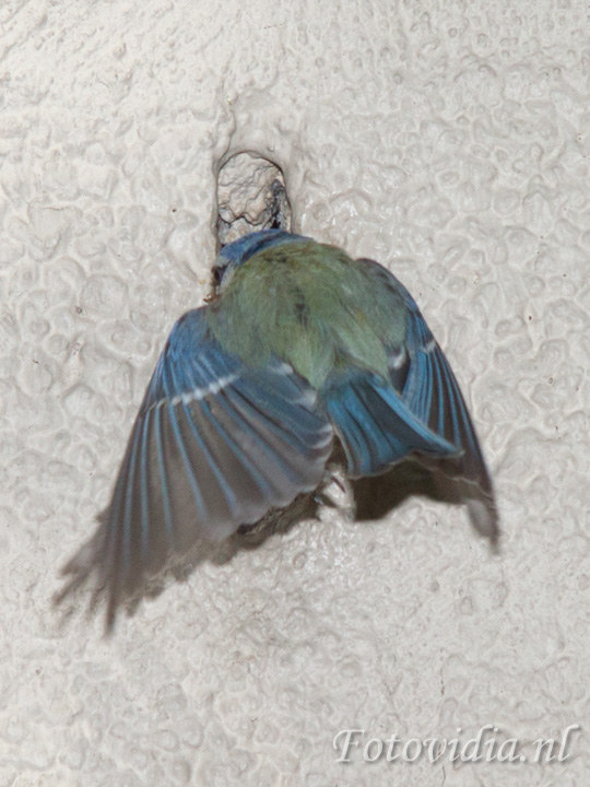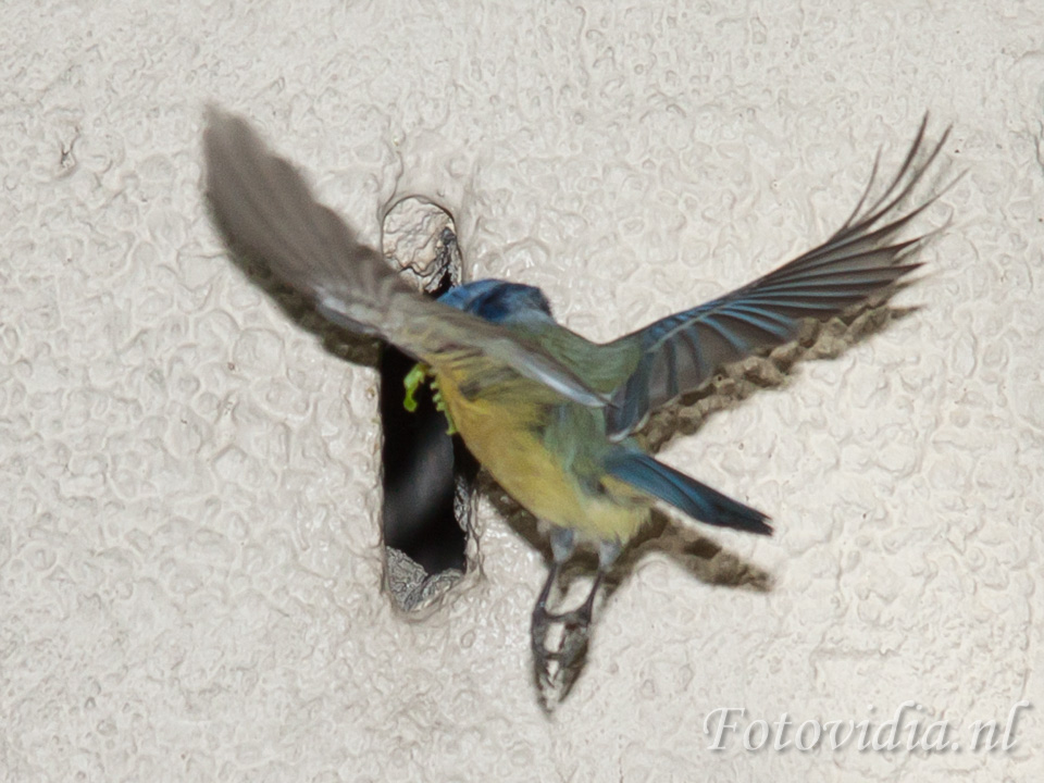 De hele dag vliegen ze af en aan met voer in hun bek. Met grote behendigheid vliegen ze door de opening.