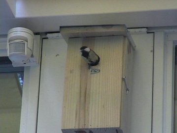 3 Maart 2001 Nestkastje opgehangen. Nestbouw in volle gang door twee koolmeesjes.