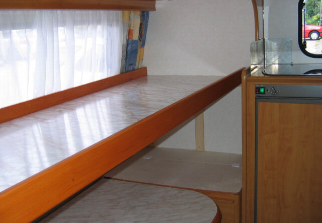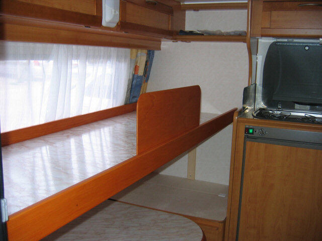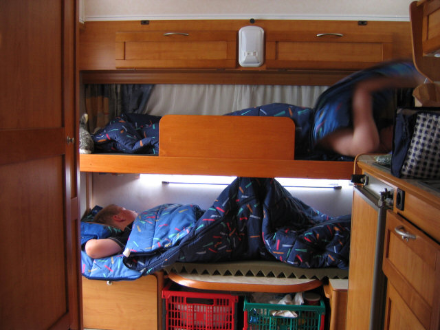 In de praktijk gaat het als volgt. De kinderen slapen alleen in de caravan bij slecht weer of onderweg. De dinette gebruiken we niet. Het stapelbed/werkblad wordt volop gebruikt om spullen op te zetten. Onder het stapelbed/werkblad worden de bed spullen overdag opgeslagen.