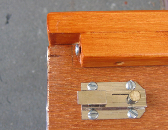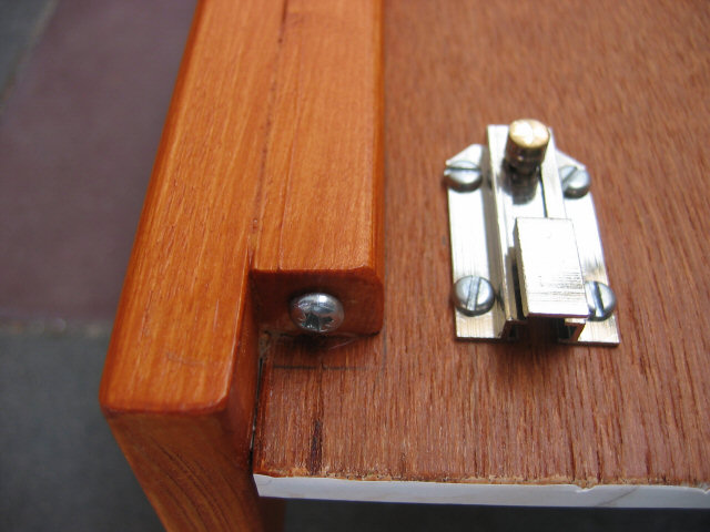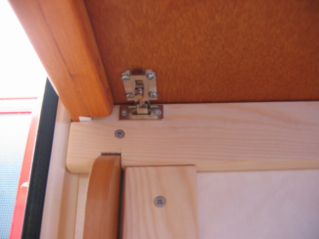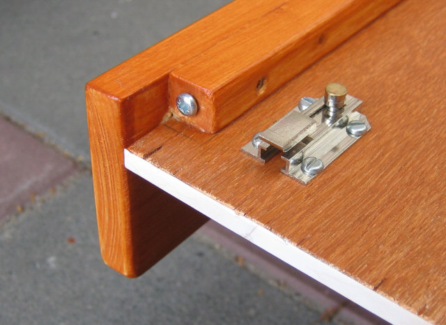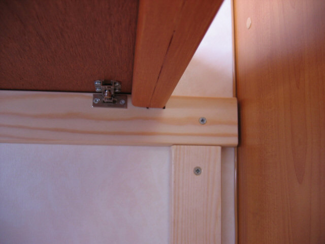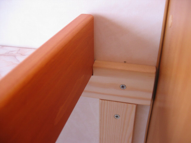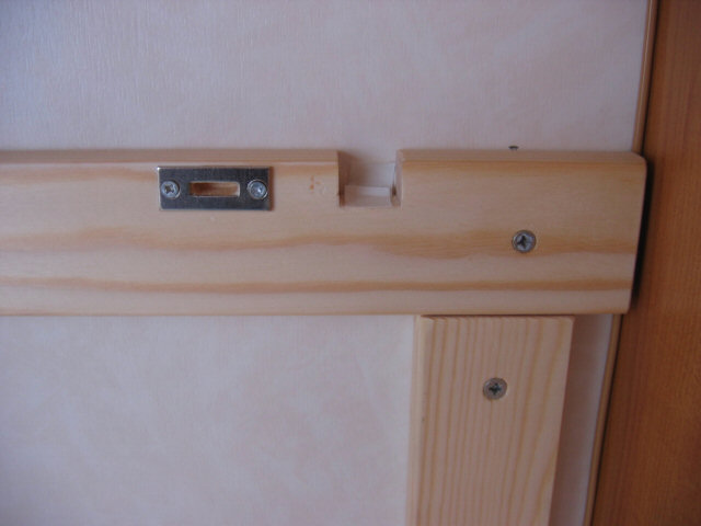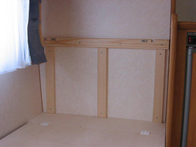 Het bed bestaat uit een plaat triplex van 10 mm dik en zij regels van 80*18 mm. Hij is 1900 mm lang ( zelf meten in Uw caravan, niet te krap maken anders krijgt U hem er niet uit. ). De buitenmaten zijn bij de deur 630 mm breed en bij het keukenblok 660 mm breed. Het bed loopt parallel met de achterwand. Het hoeklatje is 15*18 mm. Dit latje is iets korter gehouden om een stelschroefje te plaatsen, hiermee kun je de langsspeling wegstellen. Deze lat goed verlijmen voor de sterkte. (doorzakken)
