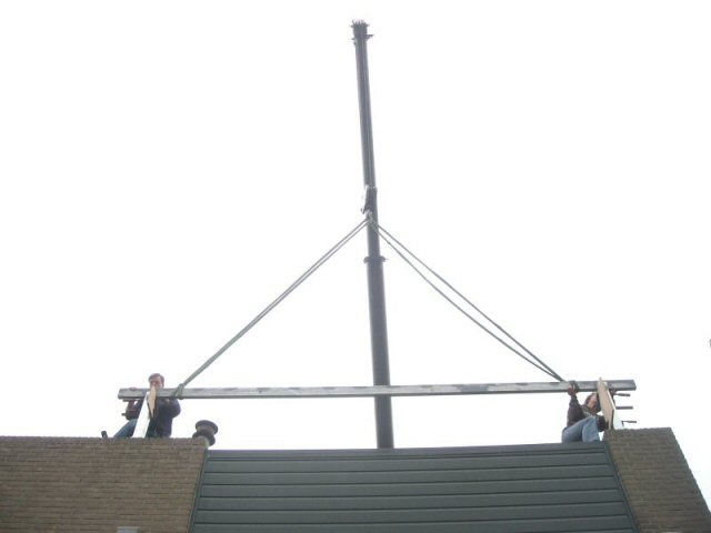 Hijskraan tilt de stalenbalk op zijn plaats.